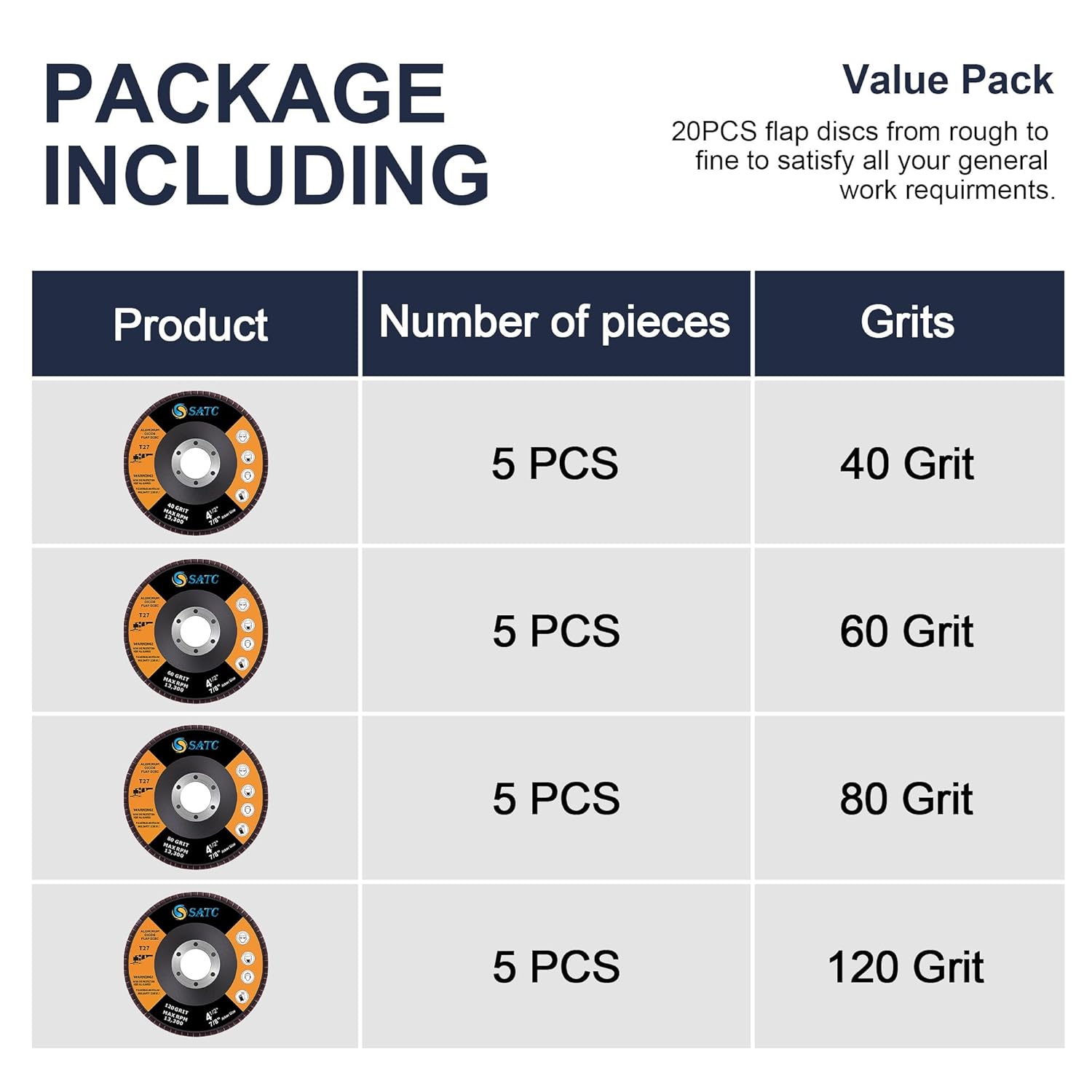 Be the first to review “SATC 115mm Flap Discs, 20-Pack Assorted Grit (40-120) for Metal & Wood Grinding”